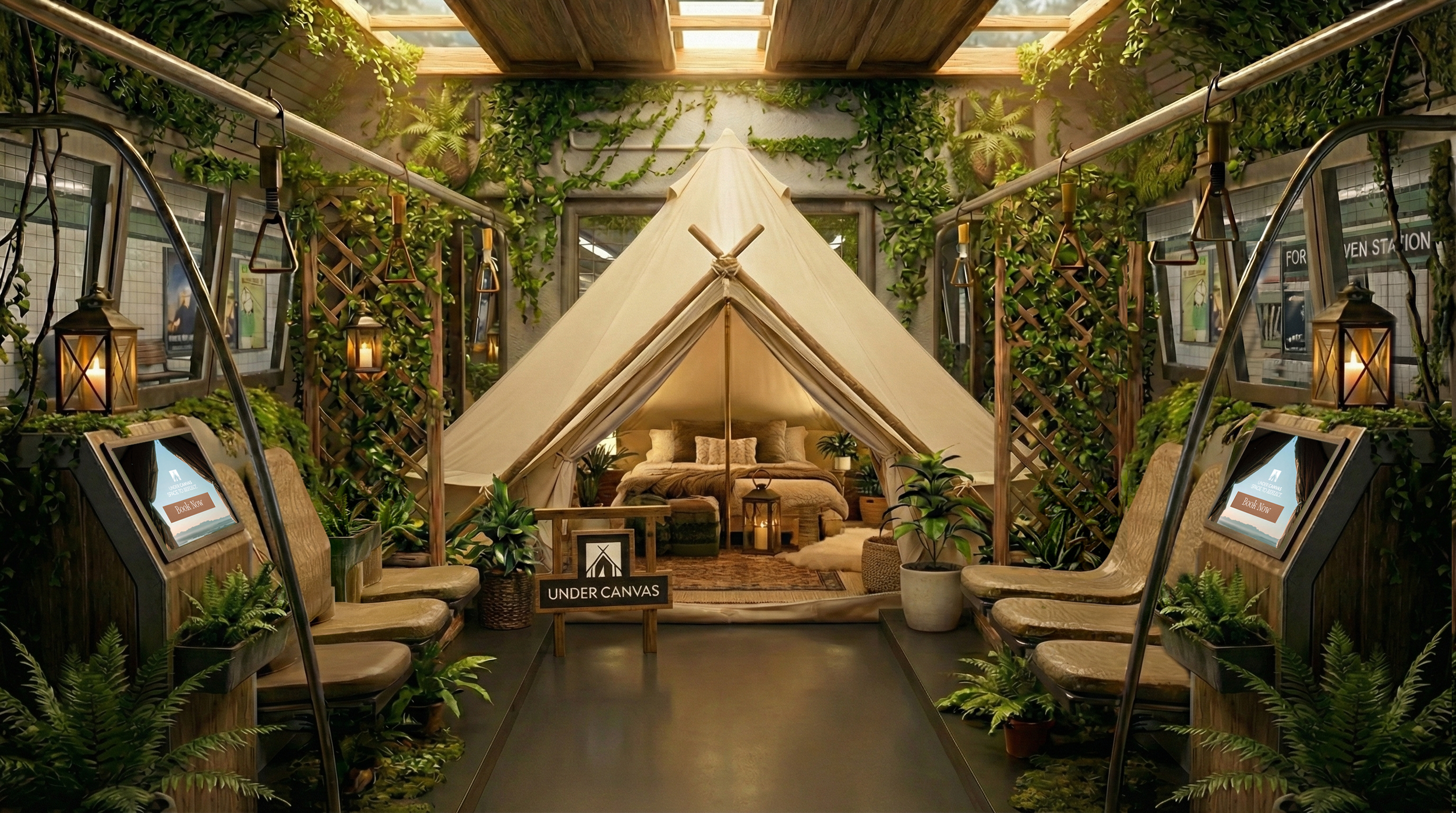 A single subway car on several lines is rebuilt as a forest or desert sanctuary. You book a short “moving escape” session for a moment of stillness between destinations.